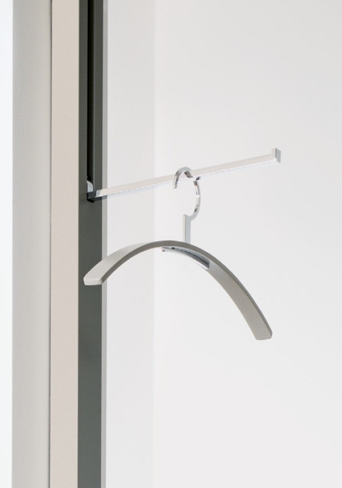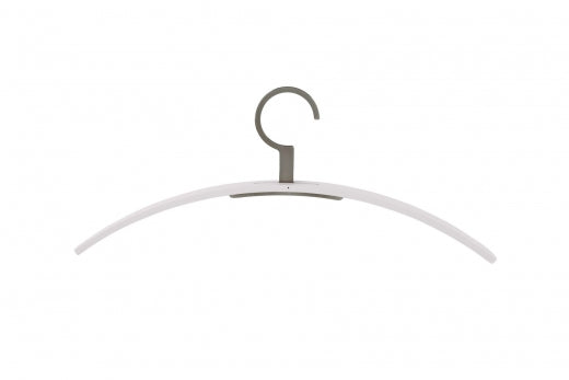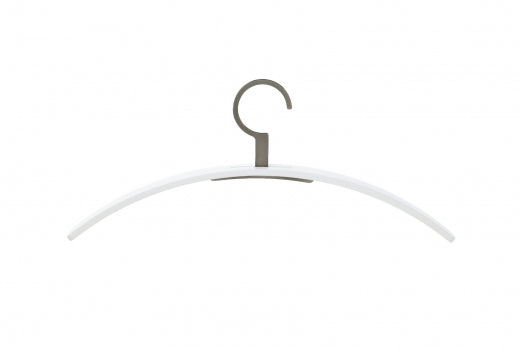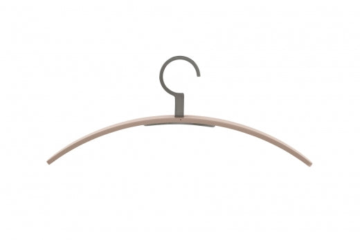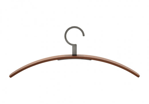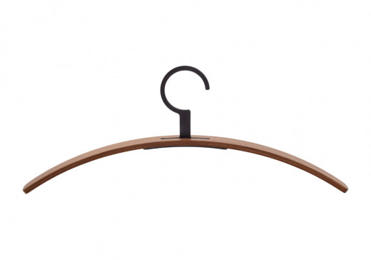 Entdecken Sie den Kleiderbügel 0130, ein Meisterwerk funktionaler Eleganz. Sein charakteristisches Designmerkmal ist der feststehende Metallhaken, der nahtlos durch den Bügel geführt wird. Dieses Modell ist aus hochwertigem, gebogenem Schichtholz gefertigt und wahlweise mit edlem Nussbaumfurnier oder in verschiedenen matten Lackfarben erhältlich.