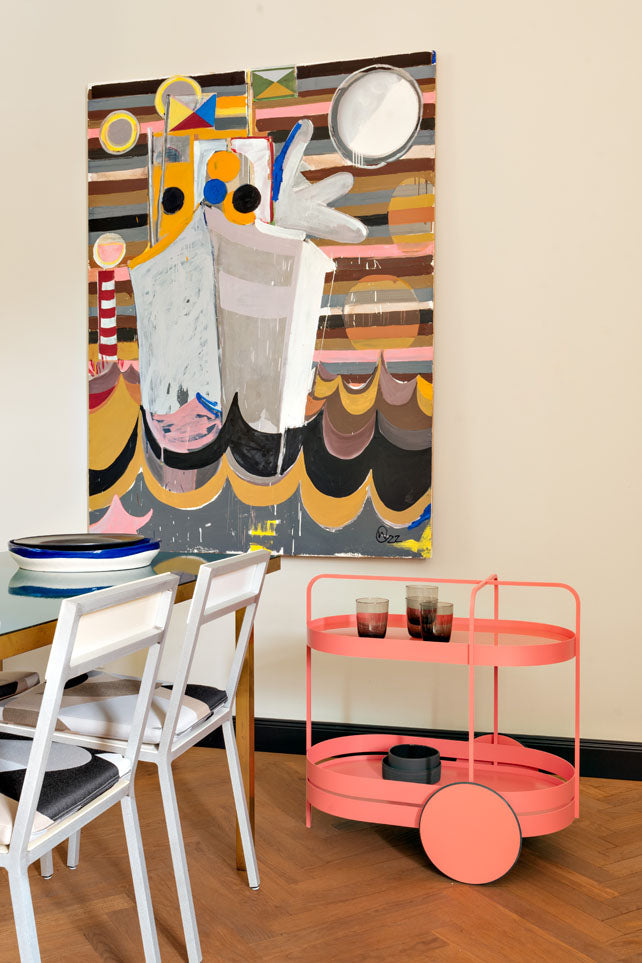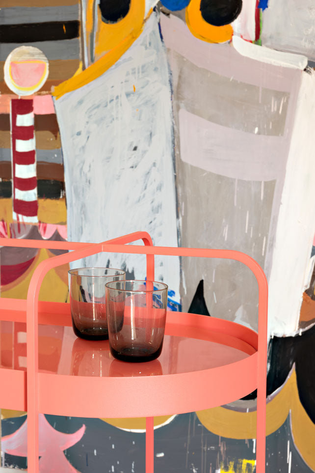 Das Gestell des Servierwagens ist aus robustem, farbig pulverbeschichtetem Metall gefertigt, das Stabilität und eine ansprechende Haptik garantiert. Die obere Ablagefläche besteht aus hochwertigem Glas, das auf der Unterseite in der jeweiligen Gestellfarbe lackiert ist. Diese Kombination sorgt nicht nur für eine luxuriöse Optik, sondern auch für einfache Pflege.
