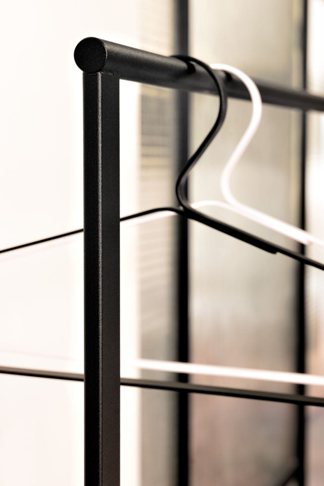 - Design: Gestell mit rechteckigem Querschnitt, Garderobenstange mit rundem Querschnitt